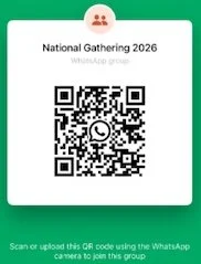 Event Notices/Communication: during national gathering there will be an opportunity to keep up-to-date with whats happening over the weekend through a WhatsApp chat. Scan the QR code to get access to the group chat.